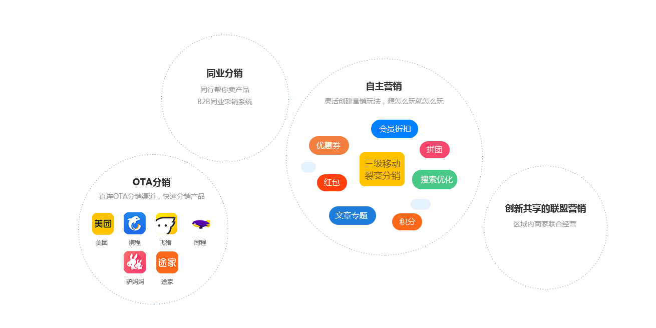 提供OTA分銷、同行渠道分銷、自主營銷玩法(移動裂變分銷、優惠劵、秒殺等)、創新共享聯盟營銷等多種營銷策略,幫助涉旅企業快速引流獲客,讓客戶瘋狂買買買。