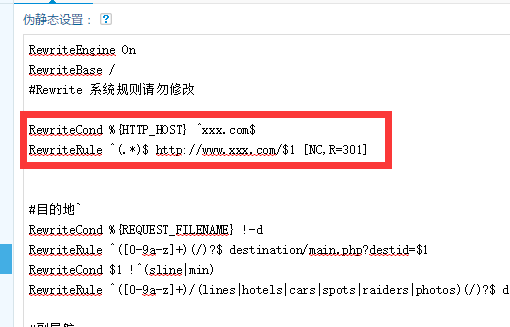 后臺登錄頁面的301跳轉需要在網站文件htaccess里改動,代碼一樣。