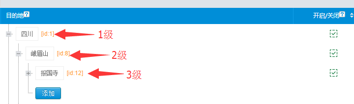 1、需要進行結伴地點的目的地,需要設置目的地,一定要三級菜單樹狀形??