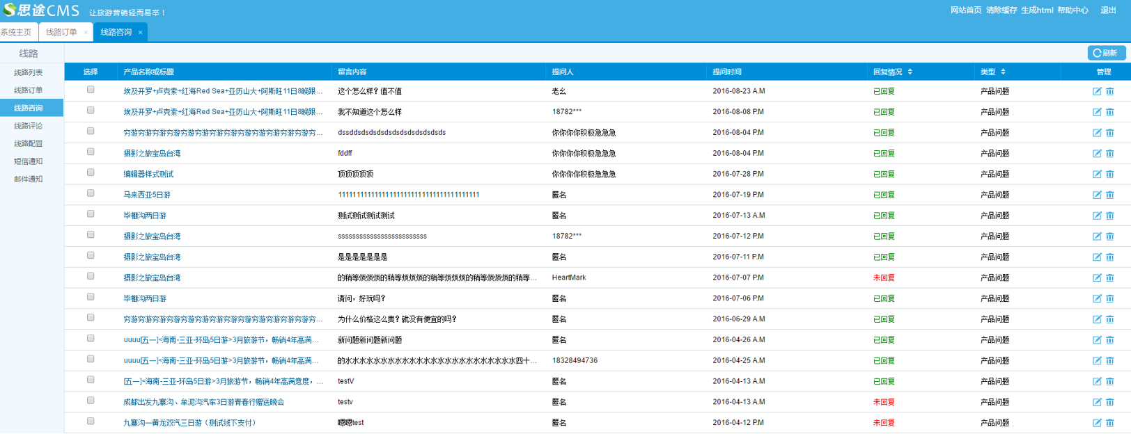可以針對線路在前臺產(chǎn)品詳情頁進行咨詢的問題進行回復管理。