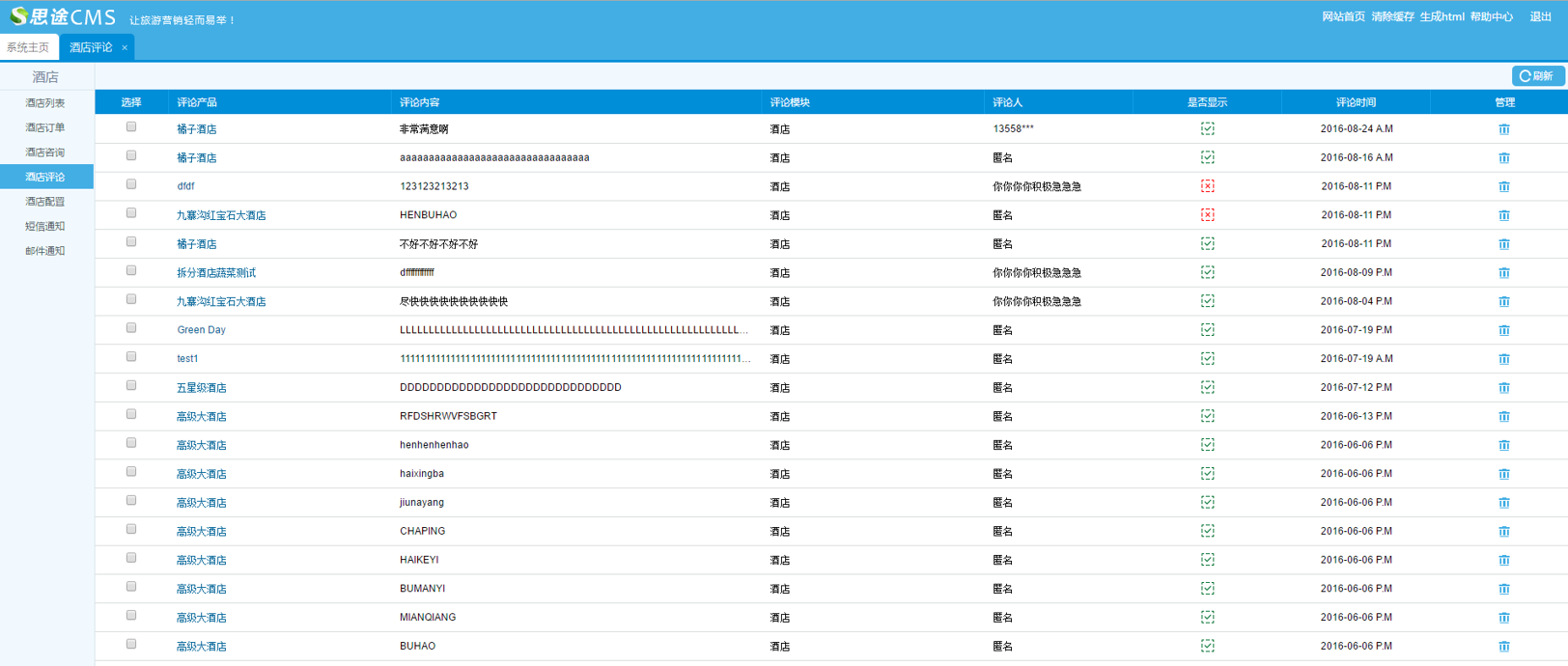 針對前臺線路產(chǎn)品詳情頁當(dāng)中,購買該產(chǎn)品的用戶消費(fèi)完成的評價管理,評價管理在后臺可以審核,查看隱藏,刪除等。后續(xù)考慮支持管理人員在后臺新增評價。
