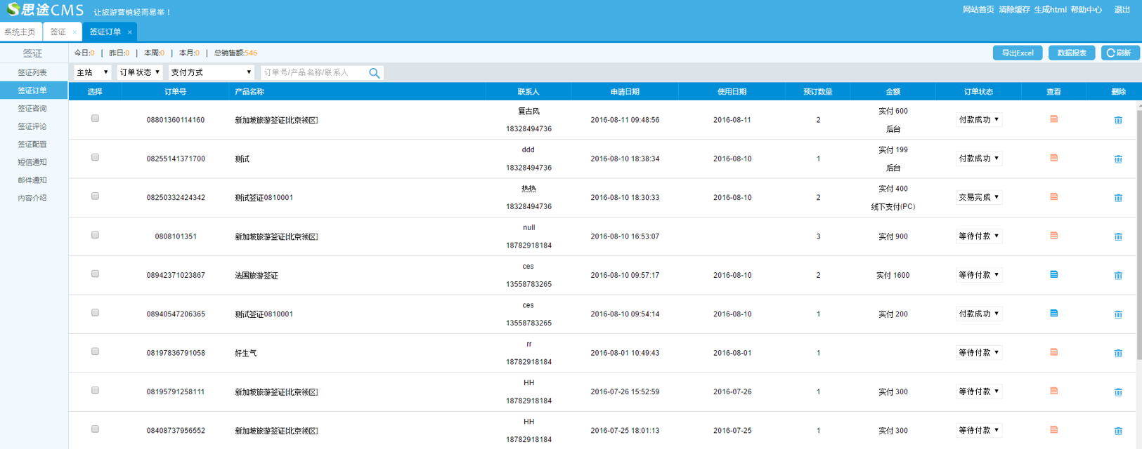 針對銷售的簽證產(chǎn)品訂單進行管理,可對訂單狀態(tài)進行修改,并支持多種支付方式設(shè)定。