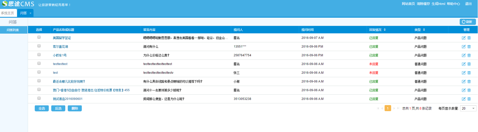 支持問答回復(fù),支持查看用戶信息,IP,支持查看用戶提問發(fā)起頁面,支持為問題設(shè)置目的地分類;支持按年月周、管理問答,支持批量刪除,人工省核,支持為問答加分。