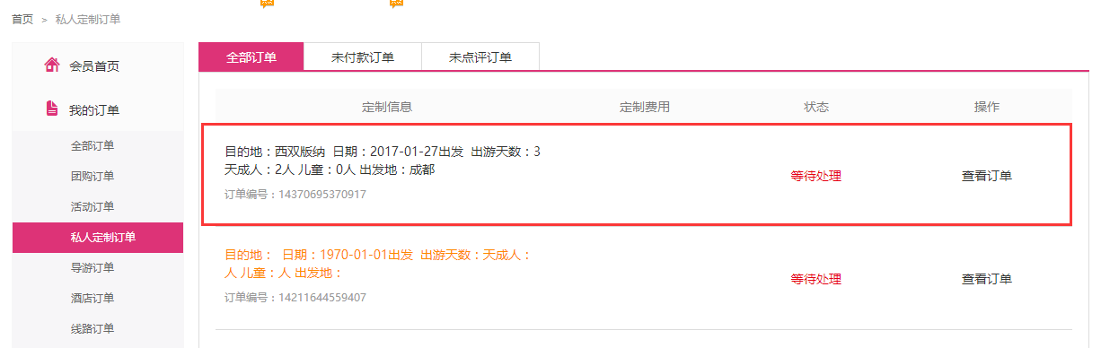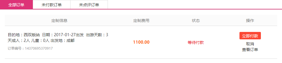 (4)前臺在會員中心查看訂單詳情:可以選擇付款和取消訂單