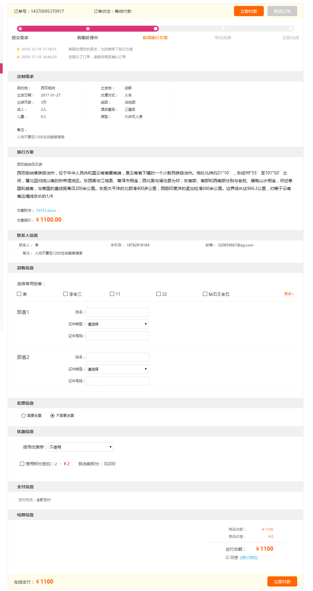 后臺系統配置中勾選了游客信息和發票,則需要填寫信息: