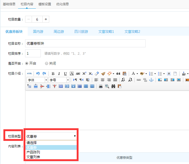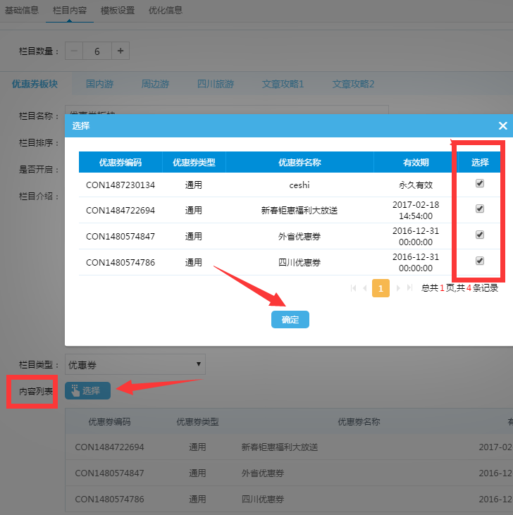 ?內(nèi)容列表處點(diǎn)擊選擇,勾選需要在這個(gè)專題展示的優(yōu)惠券產(chǎn)品即可