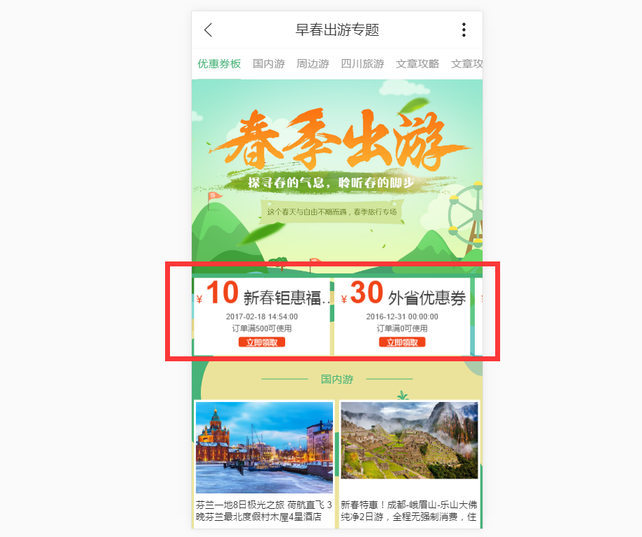 早春出游專題模板優(yōu)惠券模塊需要購買優(yōu)惠券應(yīng)用才會(huì)有優(yōu)惠券模塊展示(沒有購買不會(huì)展示)