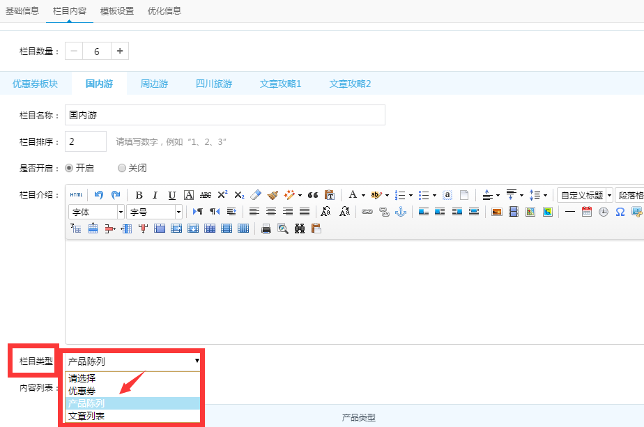 在欄目類型處選擇:產品陳列