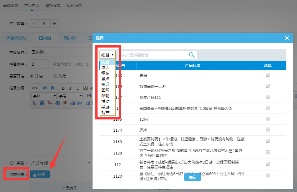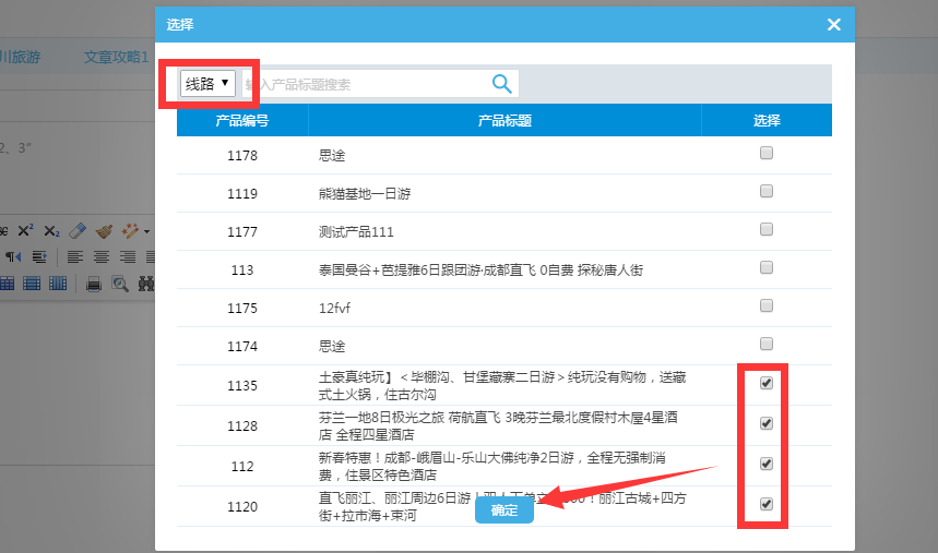 選擇好產品類型后,比如勾選了線路產品,彈窗內就會產品線路類的相關產品