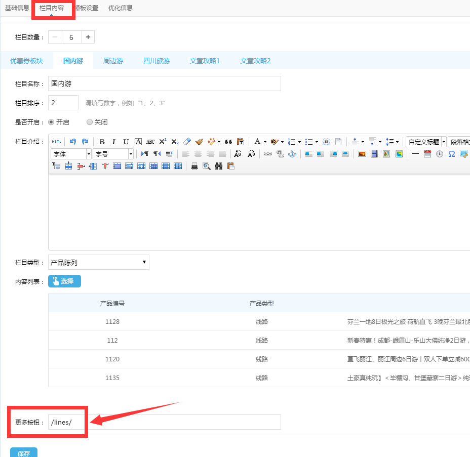 比如下方截圖中,在更多按鈕處填寫了/lines/ 這是線路欄目首頁的鏈接,客戶在專題頁國內游模塊下就會對應有一個更多的按鈕,點擊更多就可以跳轉到設置的/lines/頁面