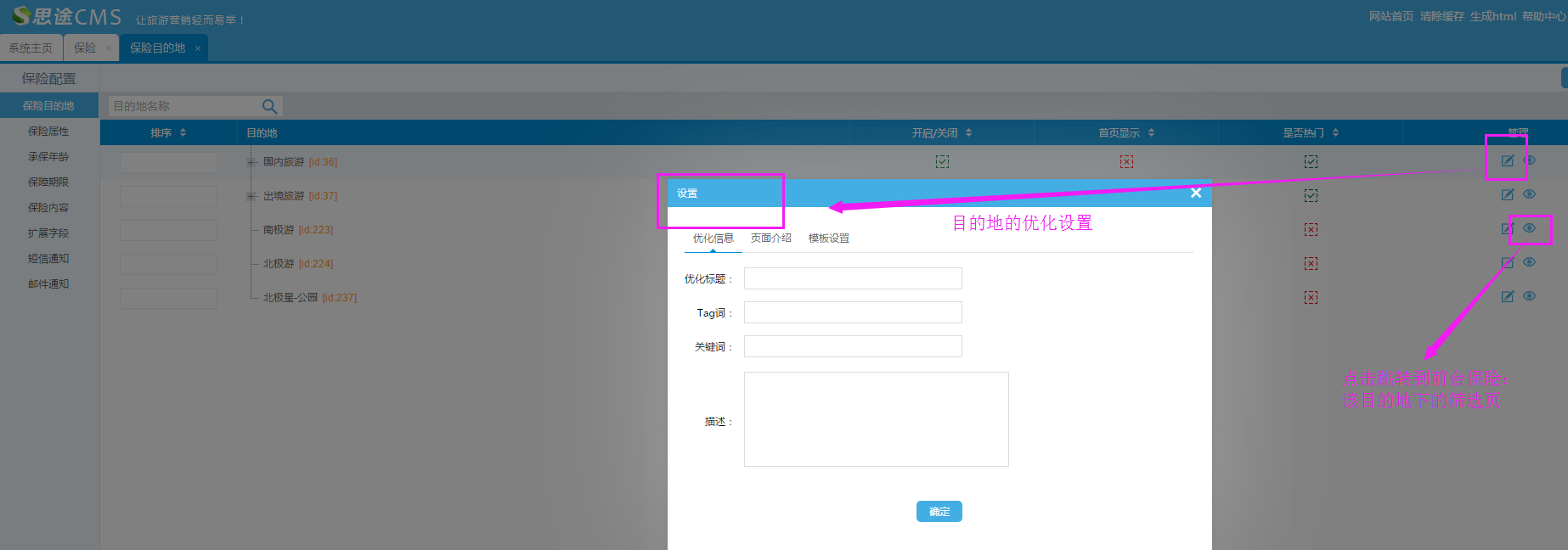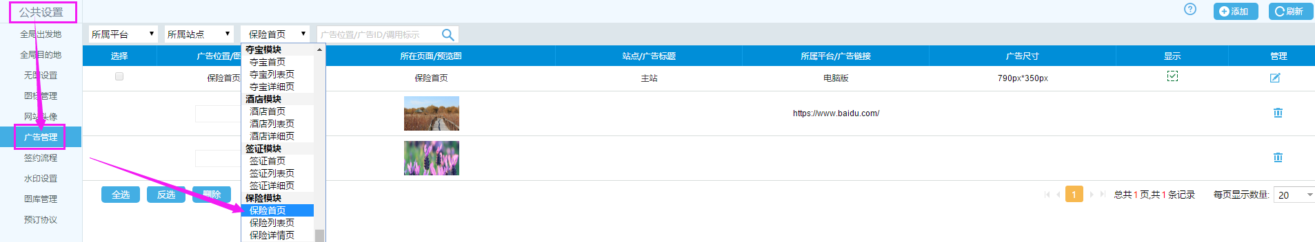 1、添加廣告位:站點管理--->公共設置--->廣告管理--->位置選擇保險首頁