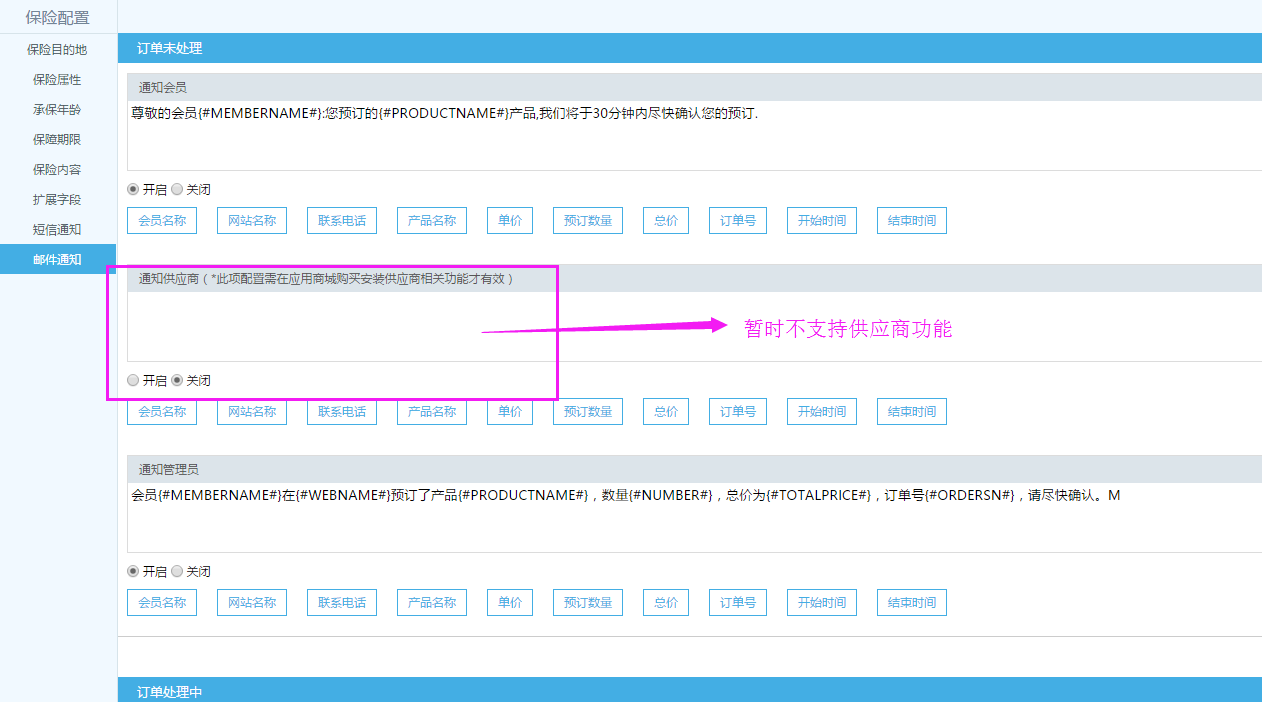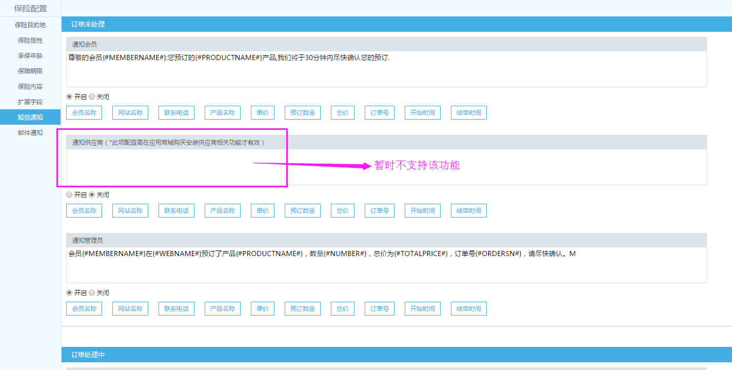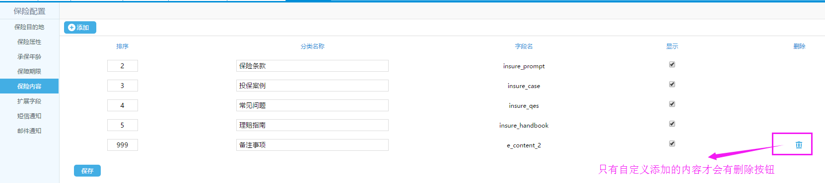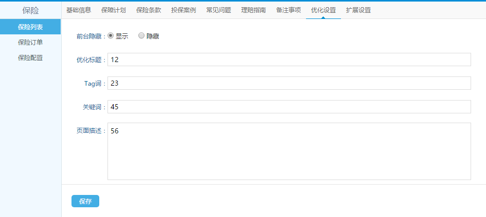 3、保險條款、投保案例、常見問題、理賠指南:均為文本框,自定義編輯,若未填寫,前臺則不會顯示該欄目