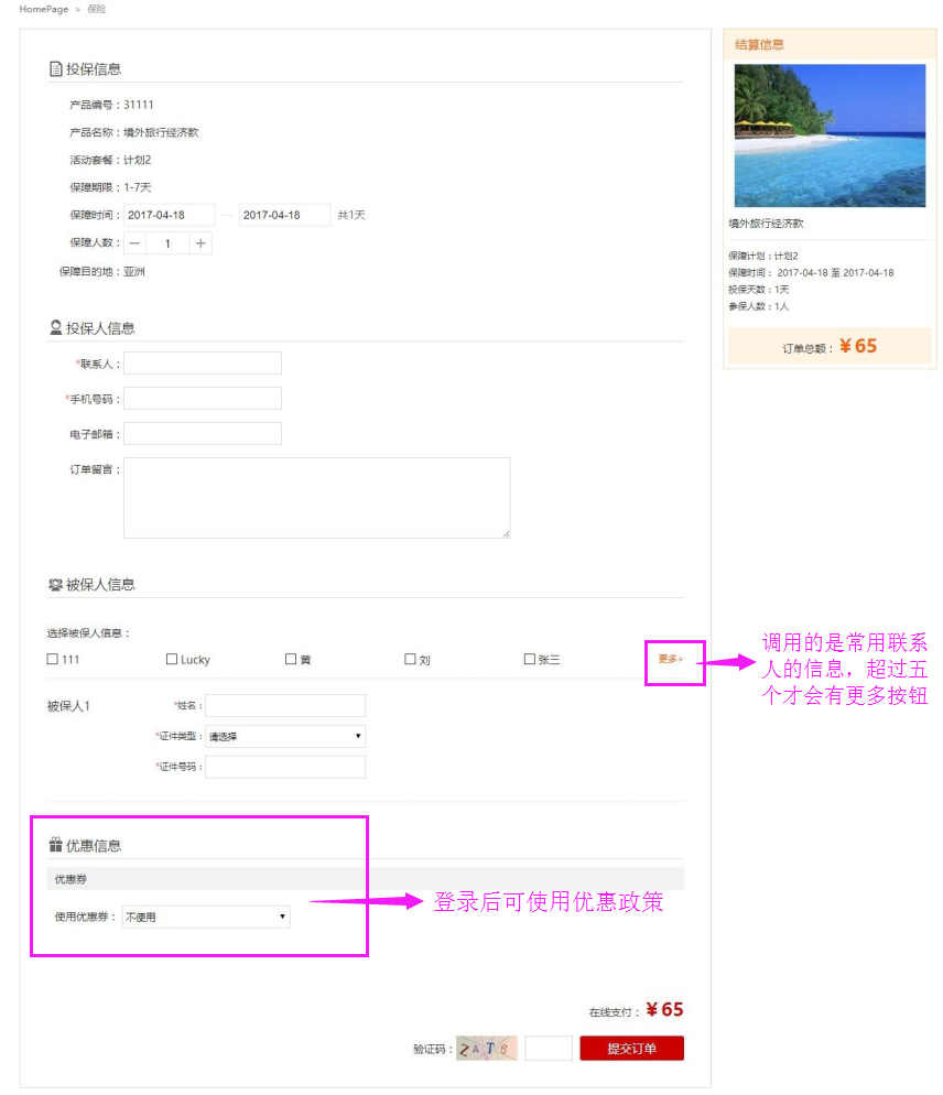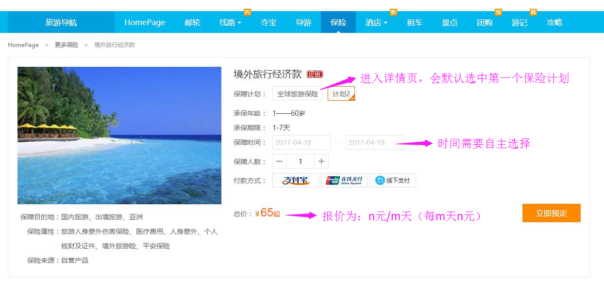 Eg:保險報價為32元/2天,該線路的行程時間為3天,則64元/人;線路人數為2人,最終保險價格則為64*2=128元