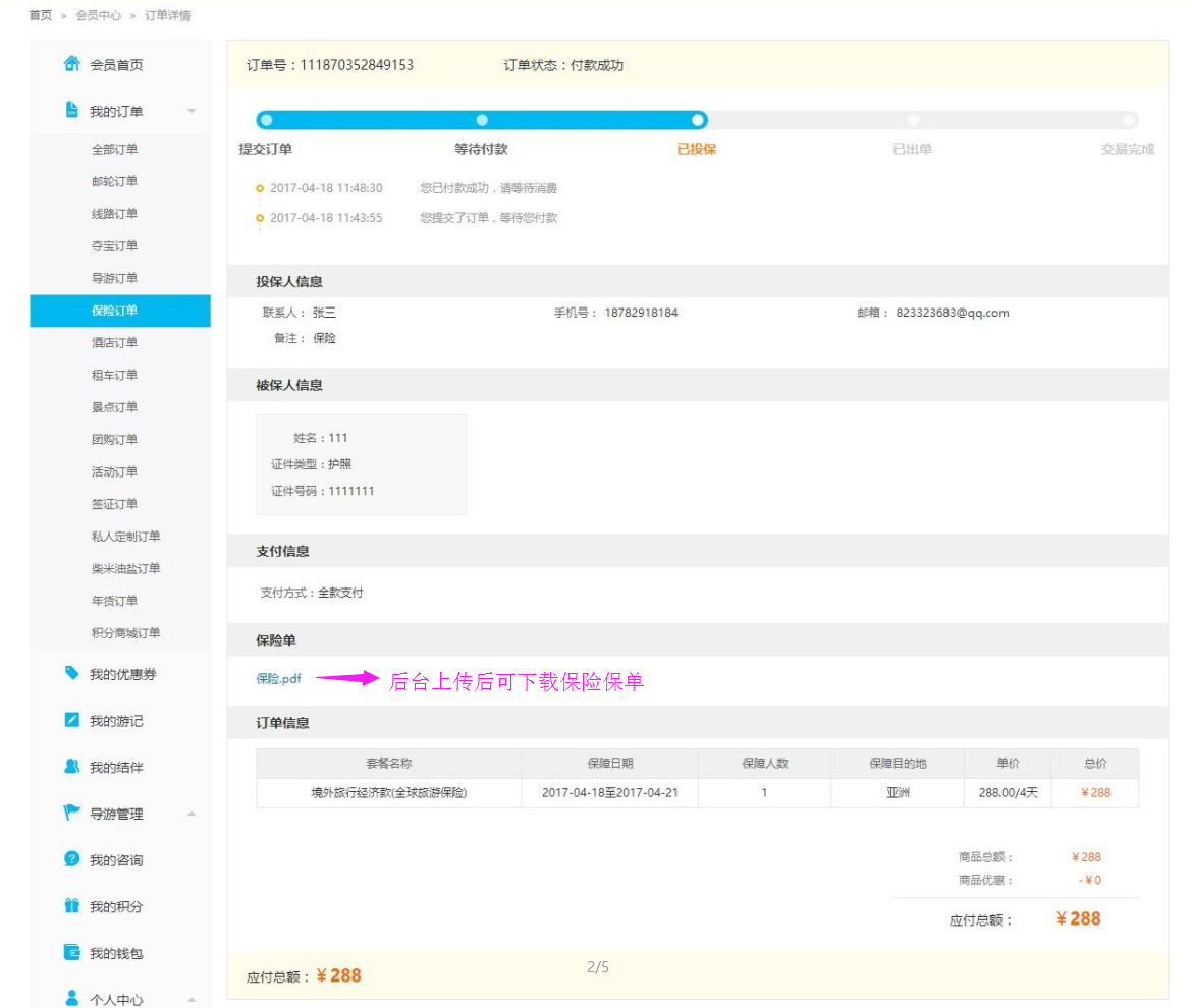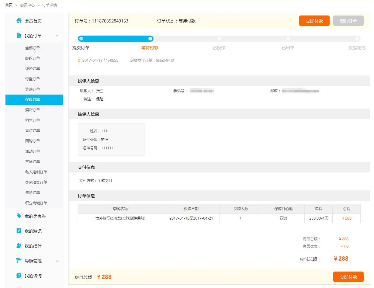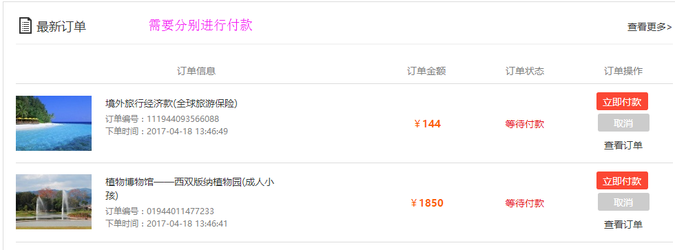 PS:線路預訂了保險后,會生成兩個訂單,保險訂單和線路訂單