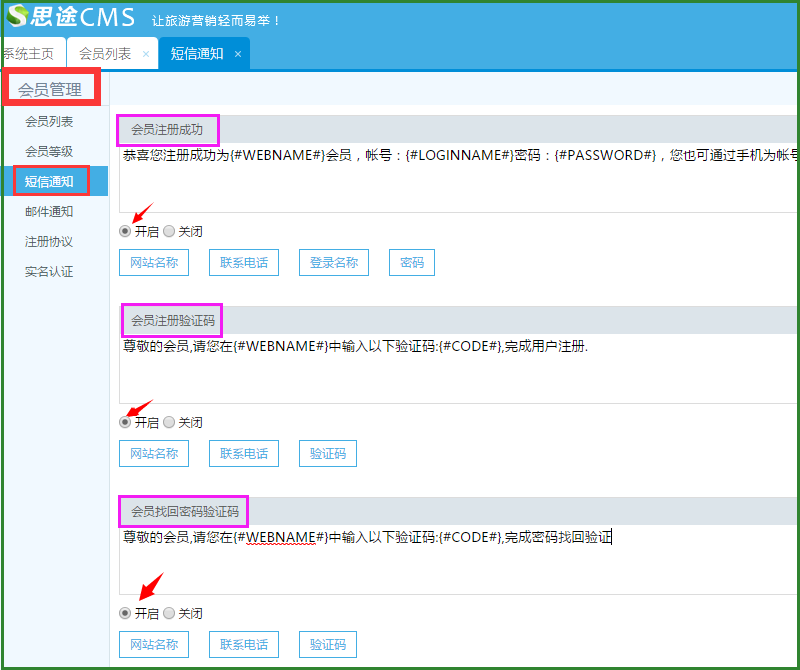 而在短信和郵箱接口配置完成以后,想要網(wǎng)站給游客或管理員等發(fā)送通知,還需要進(jìn)行下一步配置。