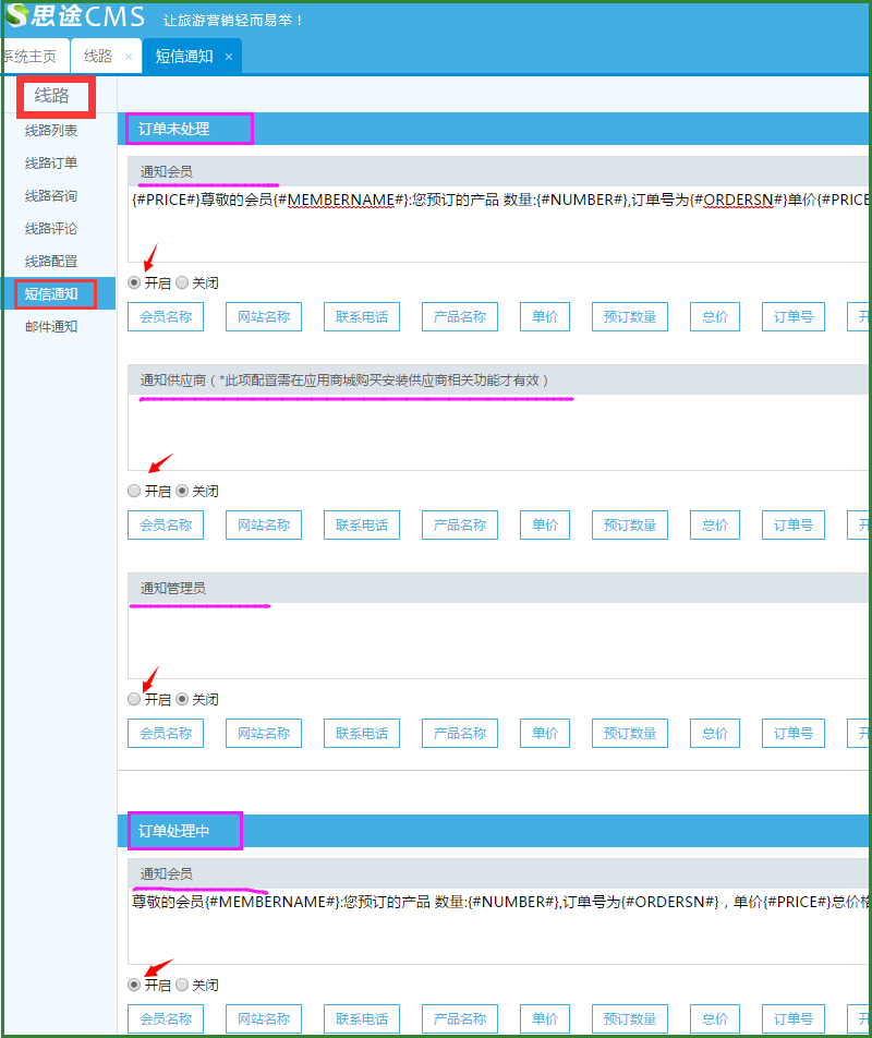 例如線路模塊,可以開啟4種訂單狀態(tài)的通知,也可以分別發(fā)送給會員、供應(yīng)商、網(wǎng)站管理員(其中供應(yīng)商需要購買安裝了相關(guān)應(yīng)用才可以,網(wǎng)站管理員的手機(jī)號碼是在用戶管理-管理員管理 中,去設(shè)置手機(jī)號碼)