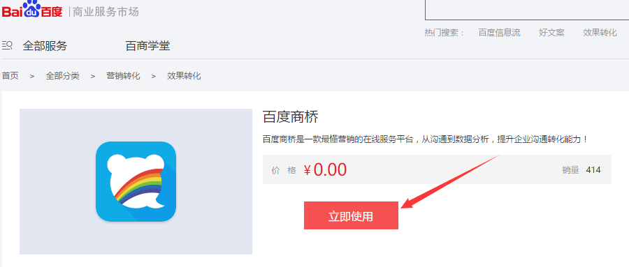 點擊“立即使用”后將自動連接到百度商橋官網http://qiao.baidu.com/home/index.html,請點擊“立即下載”,下載百度商橋客戶端: