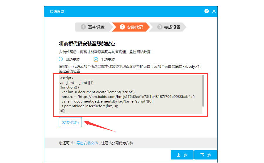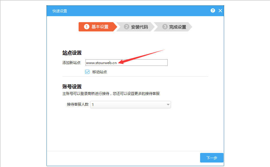 登陸后會默認彈出快速設置窗口,請設置與百度競價推廣平臺一樣的您的網站域名: