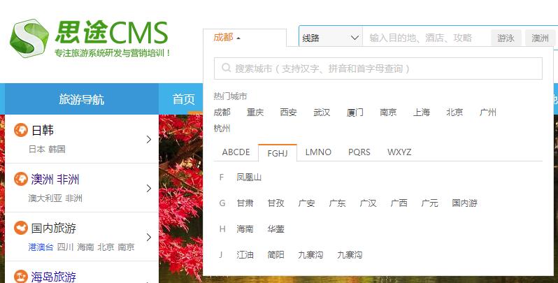 前幾天,思途又發布了一款全新的應用:城市站點應用。思途CMS用戶安裝城市站點應用后,游客訪問網站,就可以通過網站頭部的城市站點切換按鈕,快速定位和跳轉到目的地城市,實現無縫瀏覽目的地城市資訊信息和旅游產品的效果。