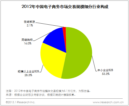 艾瑞咨詢統計數據顯示,2012年電子商務市場細分行業結構中,中小企業B2B電子商務占比53.3%,規模以上B2B占28.3%,企業間電子商務合計占81.6%;網絡購物交易規模市場份額達到16.0%;在線旅游交易規模占比為2.1%。