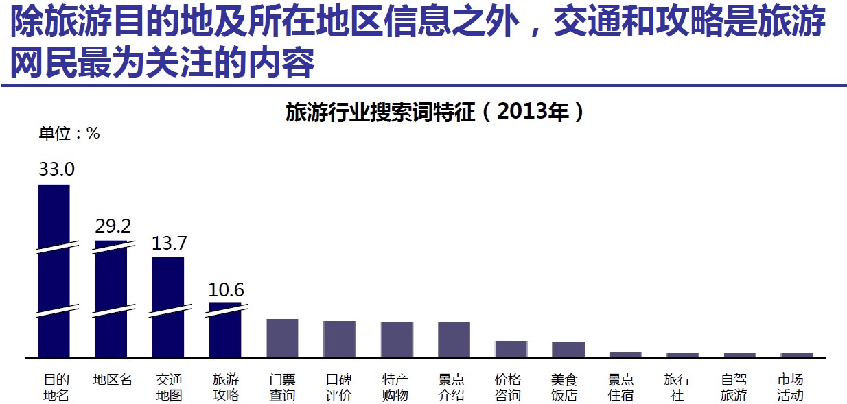 以上是百度數(shù)據(jù)研究中心提供的一份關(guān)于旅游行業(yè)搜索詞2013年的相關(guān)數(shù)據(jù),如圖所示,搜索量最大的前六位分別是目的地名、地區(qū)名、交通地圖、旅游攻略、門票查詢、口碑評價。從前六位當(dāng)中,思途歸納出以下特性: