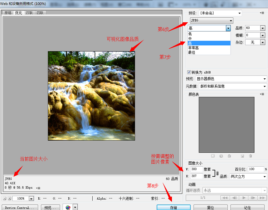第6步,第7步,可以調(diào)整圖像畫質(zhì),這里可以看到圖片的大小KB 會(huì)跟著變小,你需要選擇你顯示的尺寸不失真的最小大小就行了。