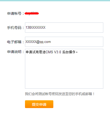 在此頁面上填寫您的申請信息如申請賬號、電話號碼、電子郵箱、申請說明等。