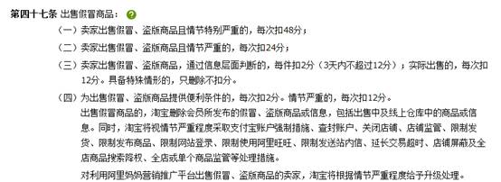 在淘寶規(guī)則(http://rule.taobao.com/detail-62.htm )第二節(jié),違規(guī)處罰中明確規(guī)定,賣家出售假冒、盜版商品,通過信息層面判斷的,每件扣2分(3天內(nèi)不超過12分);實(shí)際出售的,每次扣12分。如圖所示: