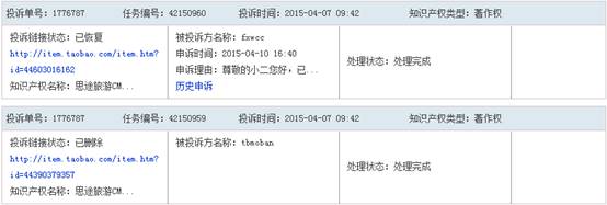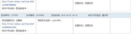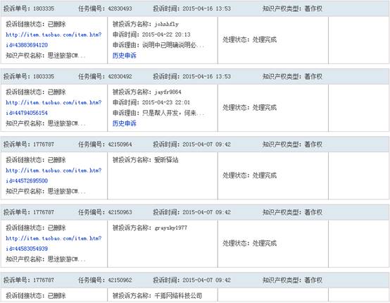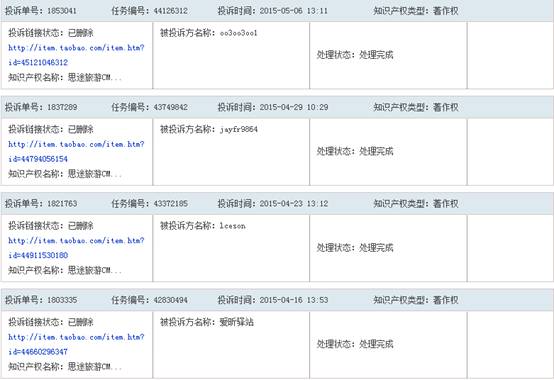 我們通過《淘寶知識(shí)產(chǎn)權(quán)保護(hù)平臺(tái)》對(duì)涉及思途CMS的盜版侵權(quán)的所有賣家和商品鏈接進(jìn)行專人跟蹤投訴,遇到一例,投訴一例,絕不手軟,投訴的結(jié)果均是刪除鏈接,并對(duì)賣家扣2分到12分。