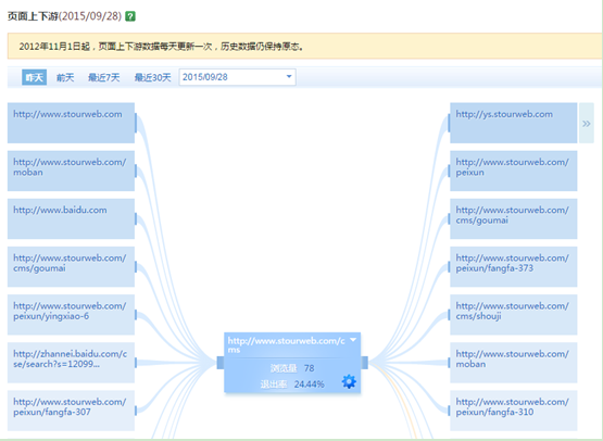 通過頁面上下游,我們可以設置需要分析的頁面,獲知他們的來路以及流量從這個頁面分發(fā)后又進入了哪些頁面。