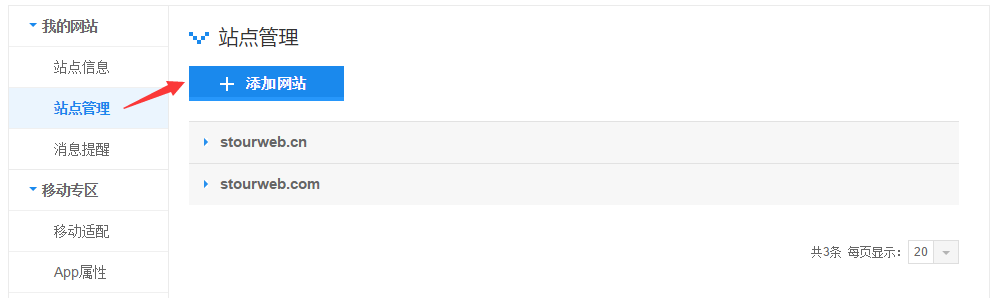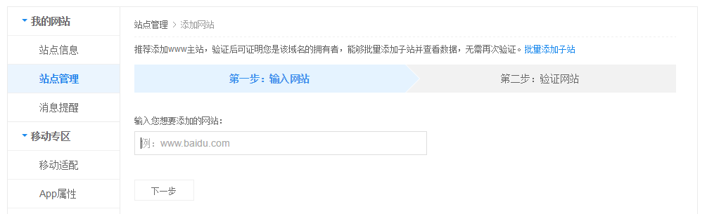 第一步:注冊并登陸百度站長平臺,點擊左側“站點管理”,選擇“添加網站”。