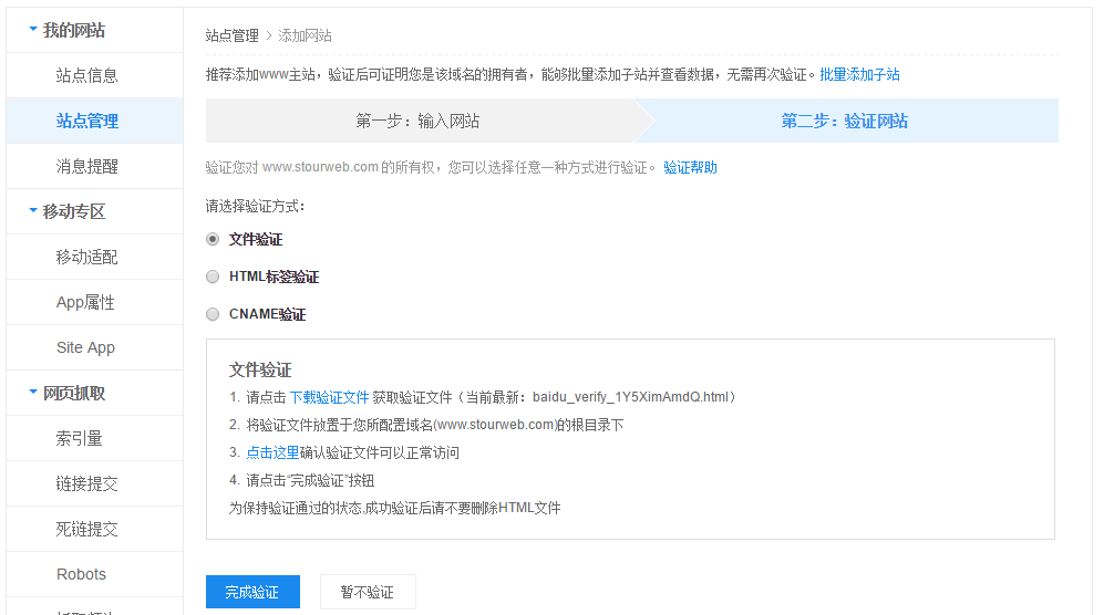 第三步:選擇百度提供的網站驗證方式,驗證對網站的所有權。