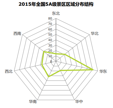 按照等級劃分,旅游景區主要分為5A、4A、3A、2A和A級景區。截止到2015年底,全國A類景區達到7000多家,高星景區(5A、4A)1500多家,其中5A級景區共有213家。從景區類型來看,5A級自然景觀景區數量占到5A景區的一半;從區域分布來看,華東地區旅游資源豐富,5A景區占比達33.2%,為七大區域之首。