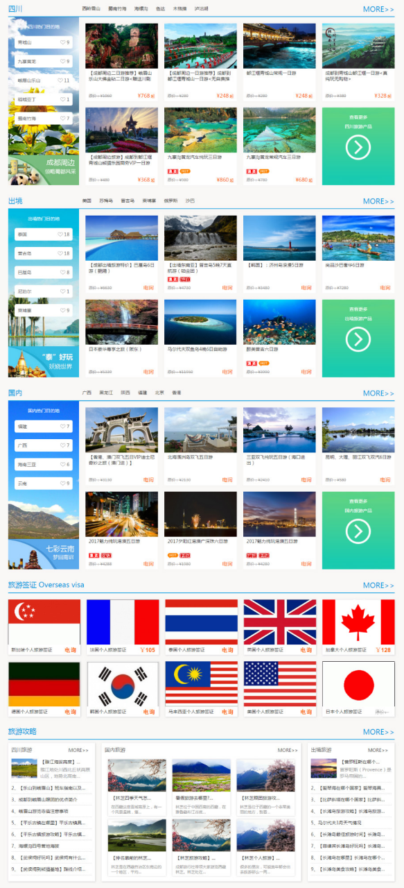 見過很多的地方旅游網站,首頁分類亂七八糟,上下不統一,用戶看著沒有頭緒。產品展示也不完整,圖片不清晰或者不具美觀,客戶體驗度很不好。優秀的旅游網站,首頁一定是分類清晰,并且各欄目產品完整,圖片清晰,從順風旅游網和某網站的首頁產品對比可以看出其優劣: