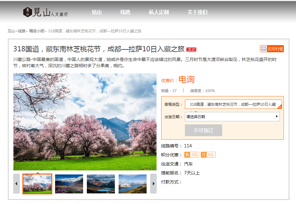 產品詳情頁的圖片至關重要,它決定著游客對這個旅游產品的第一印象。若是看到展示圖片完整、美觀,游客會在心里覺得這個景致如圖一樣。若是圖片展示不完整且圖片模糊或者雜亂,游客就沒有興趣再看下面的行程具體介紹。如使用思途CMS的見山人文旅行,它的圖片都很漂亮,并且展示完整,給人的印象很好: