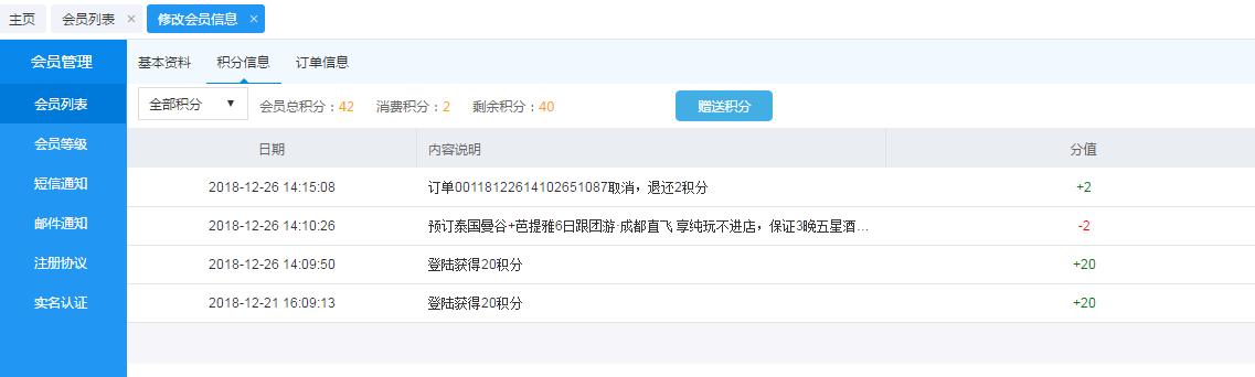 為了幫助大家更全面的管理網站會員的信息,本次我們新增了會員注冊來源、注冊時間等字段。也就是說升級之后,我們就可以在注冊會員的詳細信息中查看到他的注冊時間和來源,從而掌握不同渠道(如PC、微信、小程序等)的具體引流效果。而且在最新的版本中,管理員還可以針對某些特別的會員或老會員手動贈送積分,也就意味著,相比以前會員只能通過積分策略獲取積分,我們的管理員可以更靈活控制積分啦!
