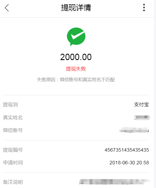 本次的優化主要是增加了手機端提現失敗原因的展示。以后用戶在申請提現之后,若遭遇不成功,微信的提現詳情里,則會顯示失敗的原因,這樣用戶更容易理解和接受,也就省去了不明情況的用戶向平臺客服溝通的成本。
