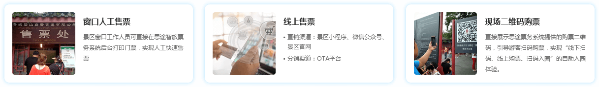 思途自主研發的景區票務系統,支持多渠道在線售票,既可實現游客“在線一鍵購票、掃碼快速入園”自助化入園體驗,同時也支持窗口人工售取票的人性化服務流程,既可有效節省景區人力成本,解決游客排隊煩惱。